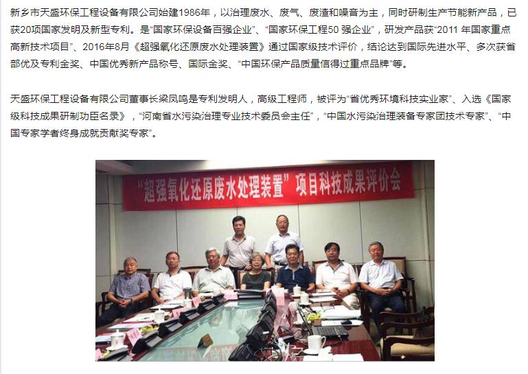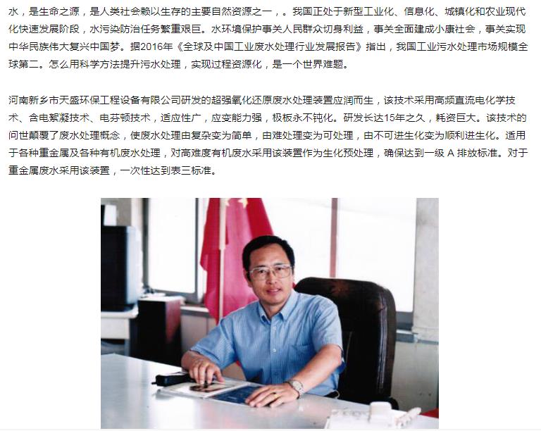 中国高新技术网发布:《关注:解码科技创新》——新乡市天盛环保“超强氧化还原废水处理技术”