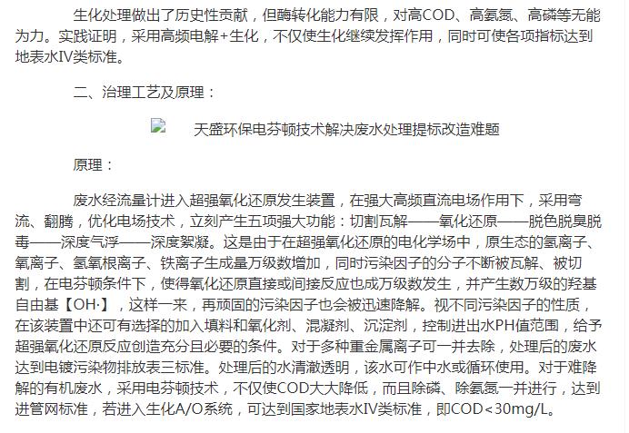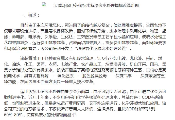 亚洲在线刊登:天盛环保电芬顿技术解决废水处理提标改造难题
